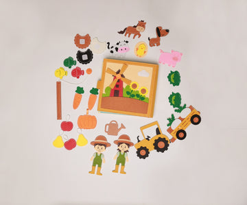 This book includes two farmers one male and one female with their tractor and trailer to get them around the farm to complete their work, the front cover also includes a windmill with a movable turbines.